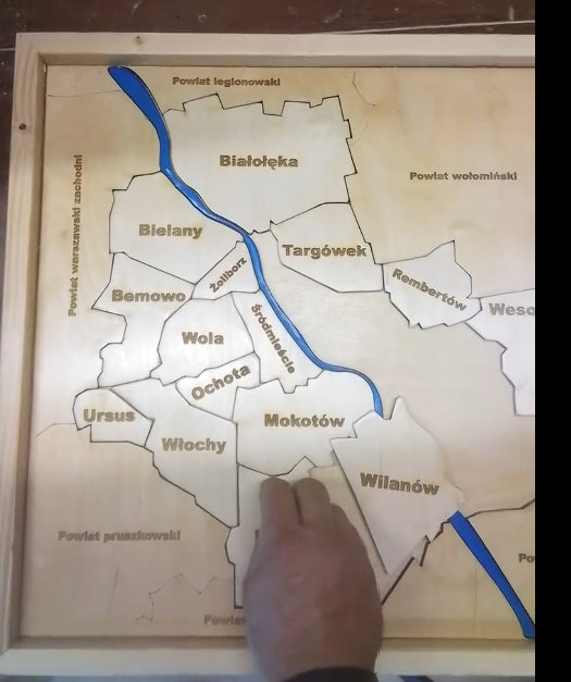 • Puzzle z dzielnicami Warszawy – każda dzielnica to osobny element, dopasowany kształtem